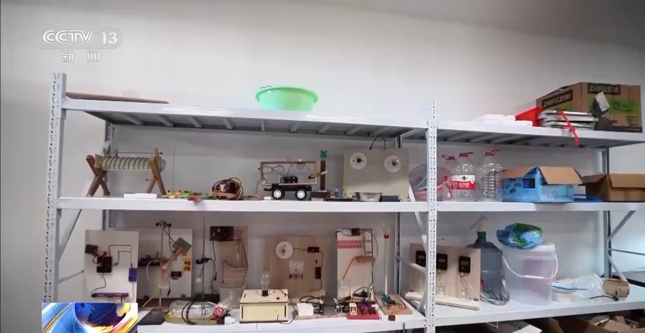 而在方汉兵的课堂上,总是惊喜连连,马德堡半球、空气炮等实验视频也在网络上广为流传。他的工作室里,更是满满一屋子的自制实验教具:LED滑动变阻器模型、电磁炮、水位自动控制、大型希罗喷泉等等。一旁的角落里,还堆着一些废弃水管、木条,方汉兵告诉我们,这些都是他捡来的废弃物,想着以后做教具的时候可以用上。货架上的“LED滑动变阻器模型”也是用废弃的羽毛球筒做成的。