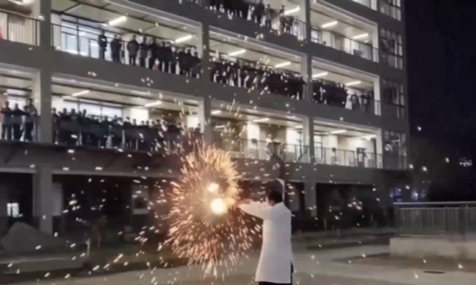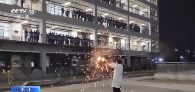 夜幕下的教学楼间,一位老师手持杆子,按下按钮后,金色 “铁花” 以设备为圆心旋转喷射,场面华丽又壮观,引得现场学生欢呼雀跃。这位老师正是方汉兵,这场精彩的表演,是他用金属管、钢丝棉等材料焊接而成的自制“打铁花”设备。